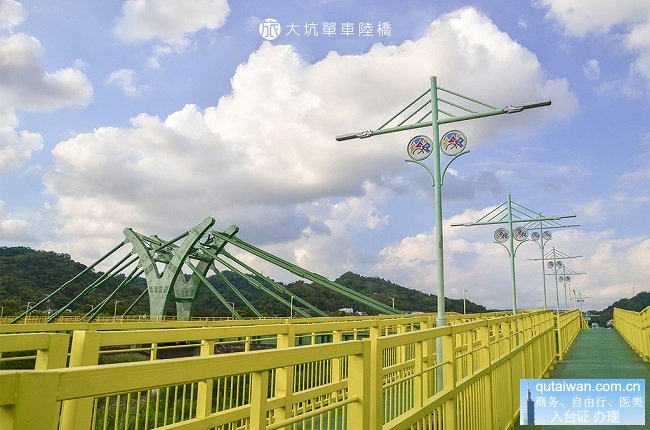 緊鄰大坑情人橋,翠綠的橋身在藍(lán)天白云之下顯得耀眼,一支支像是頂拔的竹子,對稱的彎曲曲線更有了蝴蝶橋的美譽(yù),尤其入夜點燈后,就像是一支即將展翅高飛的鳳蝶,絢爛奪目。