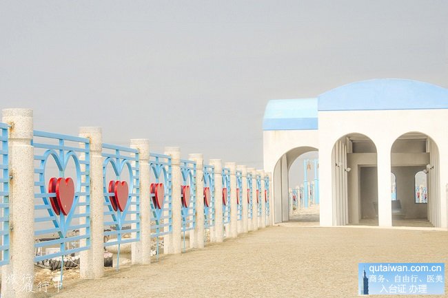 在一個鄉(xiāng)風(fēng)純樸的村莊,堤防邊點綴了地中海風(fēng)格的欄桿,上頭懸掛著顆顆鮮紅愛心,一旁還有潔白拱門頂著水藍(lán)色屋頂,任由微風(fēng)徐徐拂過雙頰,仿佛來到希臘地中海般的國度。